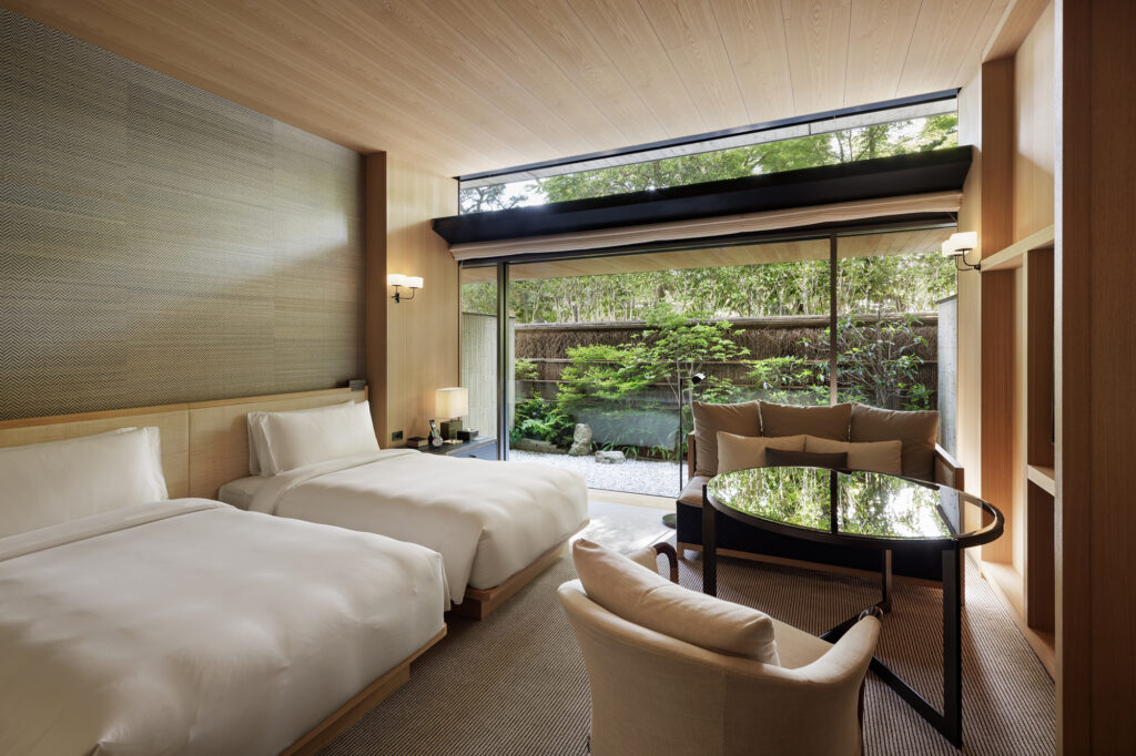 Rooms at Park Hyatt Kyoto are crafted as tranquil cocoons, with tamo wood, Japanese cypress, soft textiles, original artwork, and views that shift gently with the seasons.